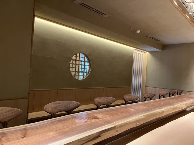 The chef is solid on the basics yet leaves room for a distinctive touch. The meal begins with moderately fatty, sweet flesh of tuna sushi, followed by sea urchin wrapped in nori as a way to compare flavours. Pursuing originality, a single piece of shiitake mushroom sushi follows. Sushi of botan shrimp and thick rolled omelette flavoured with soup stock is also distinctive. In summer, the chef serves rolled cucumber sushi, using cucumbers grown by his parents. The meal ends with soy sauce ice cream, a flavour only a sushi shop could offer.